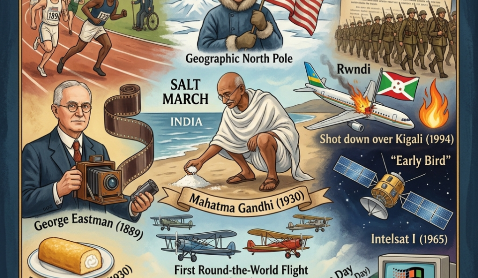 1889: Kodak is Born189619091917192419301930: Gandhi Shakes an Empire:1930: The Twinkie Invented19381938: The Discovery of Teflon1965: "Early Bird" Satellite19921992: Windows 3.1 Released19941994: The Rwandan Genocide BeginsAprilChakri Day (Thailand)International Day of Sport for Development and PeaceNational Tartan DayReaching the North PoleThe First Modern OlympicsThe U.S. Enters World War I